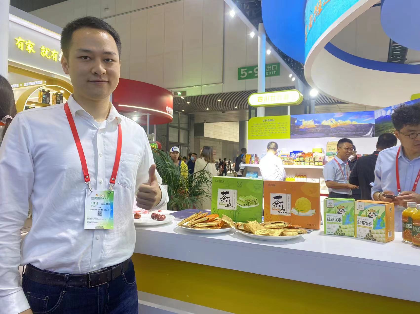 在天府龙芽展台,不仅能品饮到各个种类的茶叶,还有琳琅满目的茶食品。天府龙芽的蛋卷、龙芽酥、米花酥系列产品,外形精致小巧,口味清甜独特,抿一口茶食,啜一口香茗,茶点与茶汤之间的滋味碰撞可谓相得益彰。